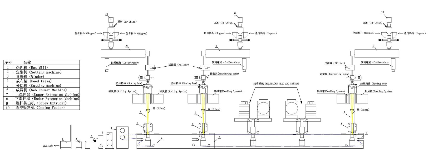 itthon / Termék / Spun-Met nemszőtt gép / Ötsugaras (SMSSS) Spun-Melt nemszőtt gép